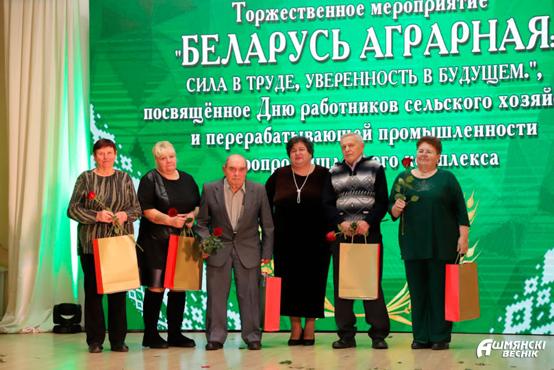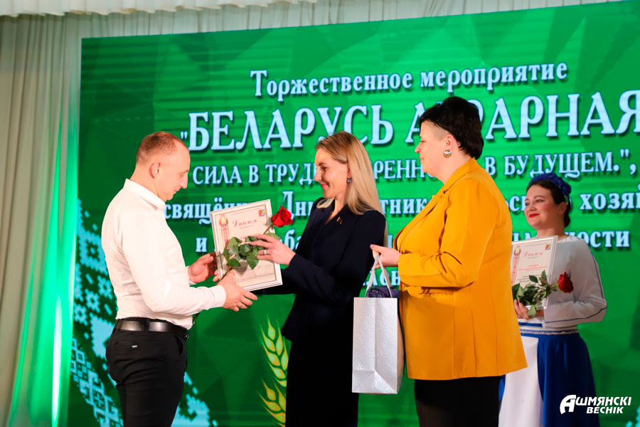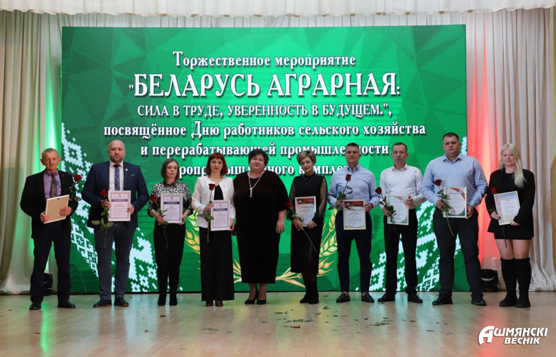 Поздравительную эстафету продолжил председатель Ошмянского районного Совета депутатов Юрий Карпович, вручивший почетные грамоты и благодарности лучшим труженикам сферы. Почетной грамотой Ошмянского районного Совета депутатов награждены электрогазосварщик Ошмянского производственного участка дочернего унитарного Сморгонского предприятия мелиоративных систем Сергей Андриевский, ветеринарный врач районной ветеринарной станции Андрей Боровский, гидроциклонщик ОАО «Гольшанский крахмальный завод» Олег Горлукович, тракторист-машинист СУП «АгроГроди» Анатолий Спиридович, мастер производственного обучения Ошмянского аграрно-экономического колледжа Дмитрий Томялович. Благодарственное письмо председателя Ошмянского районного Совета депутатов принимали формовщик колбасных изделий ОАО «Ошмянский мясокомбинат» Валентина Воронюк, тракторист-машинист СУП «АгроМолРай» Станислав Коваленок, грузчик ОАО «Агропромтехника» Валерий Суровец, заведующий нефтескладом КСУП «Краковка» Светлана Шляпятис, начальник участка Ошмянского сыродельного завода Александр Юхевич.
