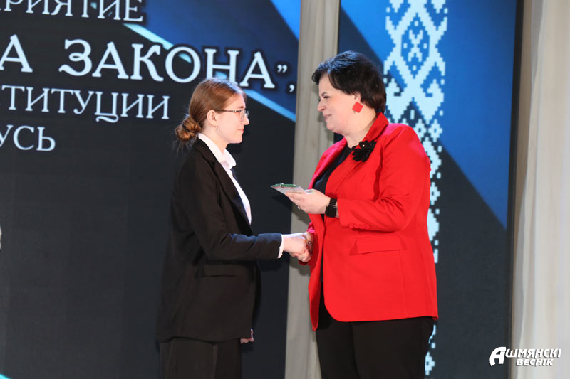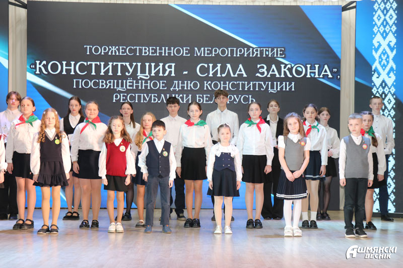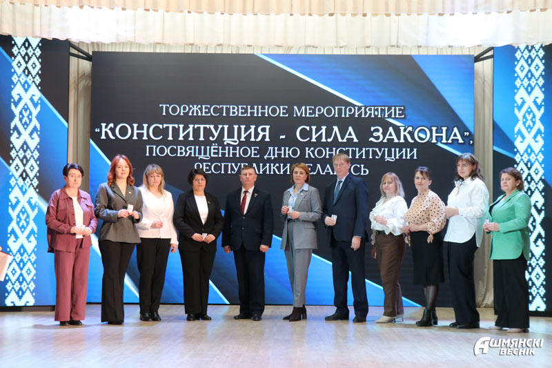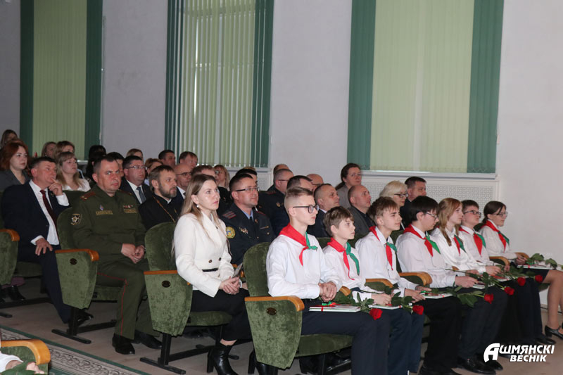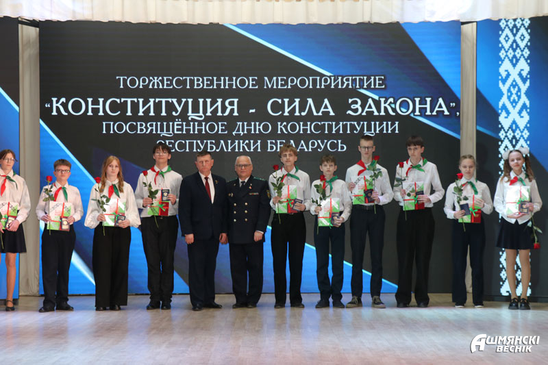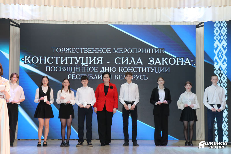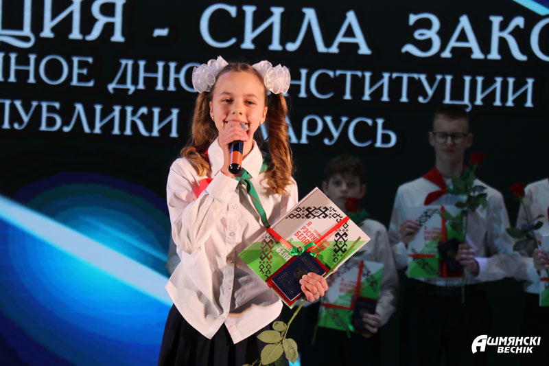 В торжественной обстановке свои первые паспорта, а также подарочные издания «Я – гражданин Республики Беларусь» получили юноши и девушки, которым исполнилось 14 лет. Все они уже проявили себя в учебе, науке, творчестве, спорте. Главный документ гражданина Республики Беларусь они получили из рук Юрия Карповича и прокурора Ошмянского района Сергея Ковальчука.